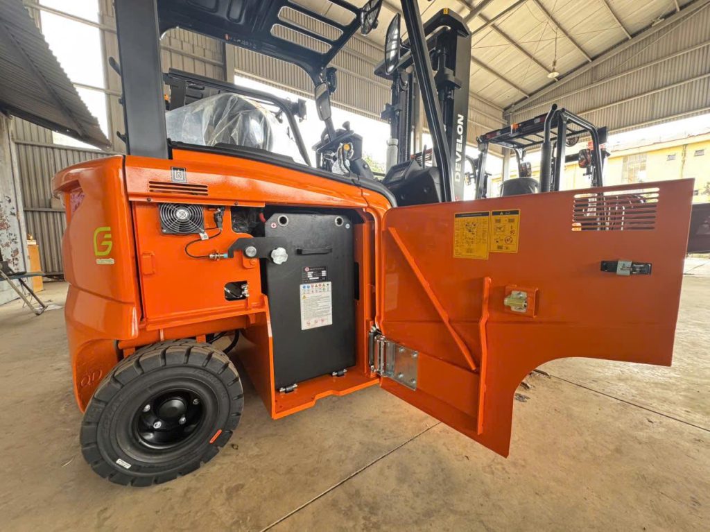 Xe nâng điện Develon 2 tấn thuộc phân khúc xe nâng tải trọng trung bình, sử dụng motor điện và hệ thống ắc quy công suất cao thay cho động cơ đốt trong.